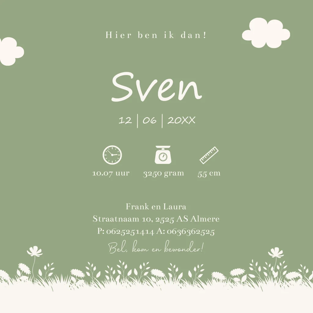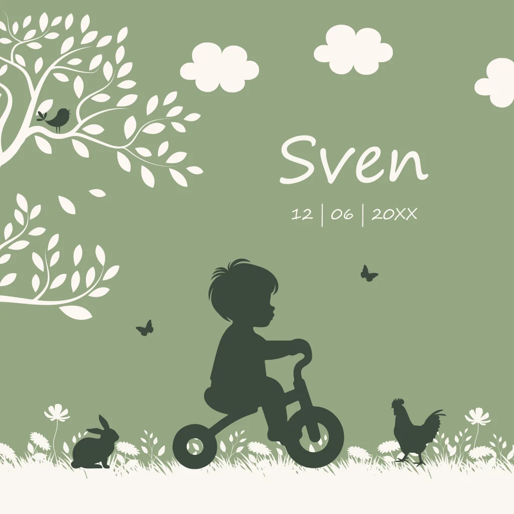 Hip geboortekaartje groen met silhouet jongen op fiets, boerderij dieren, vlinders, boom en bloemen. Pas de kleuren naar wens aan.
