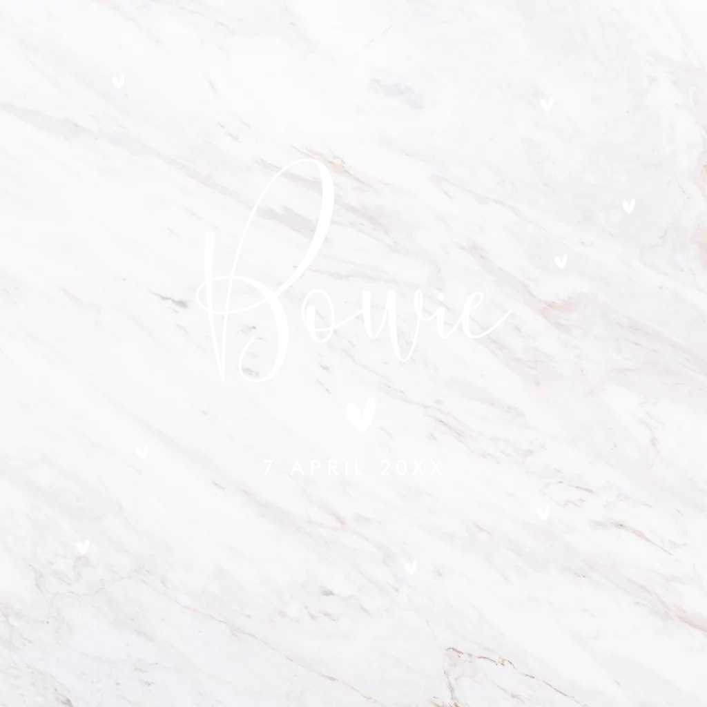 Geboortekaartje voor een jongen of meisje wit met marmerlook, hartjes en goudfolie.