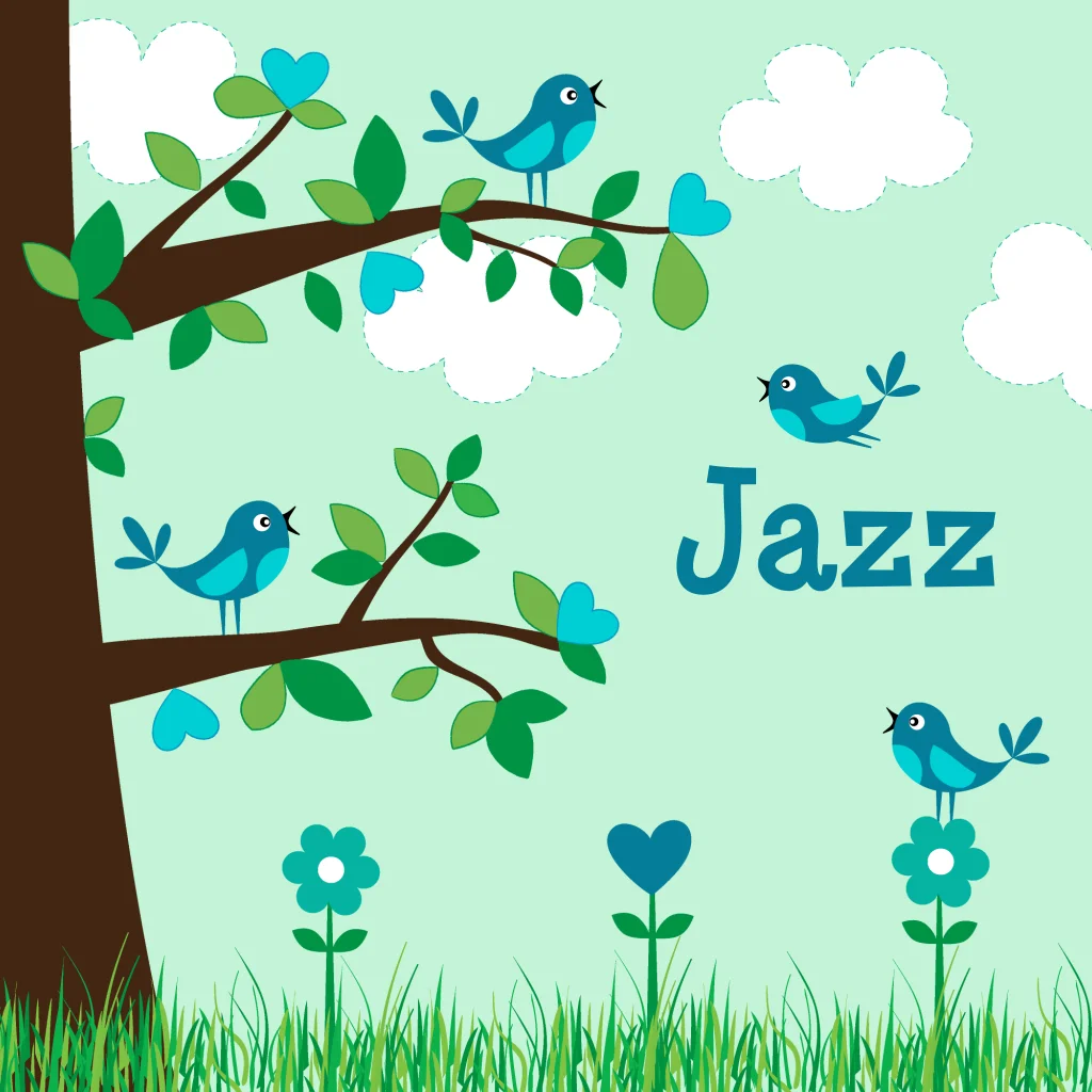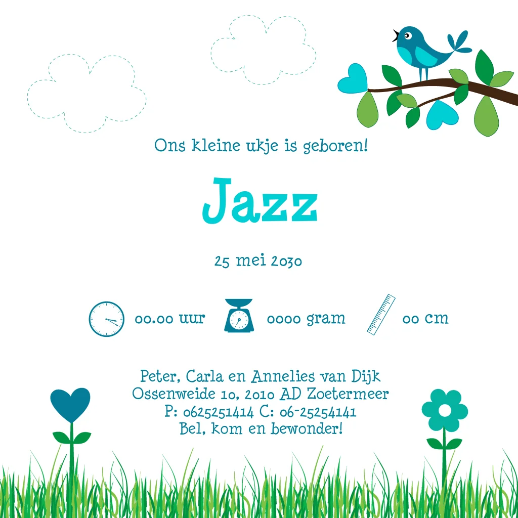 Een hip en vrolijk geboortekaartje met vogeltjes in een boom.