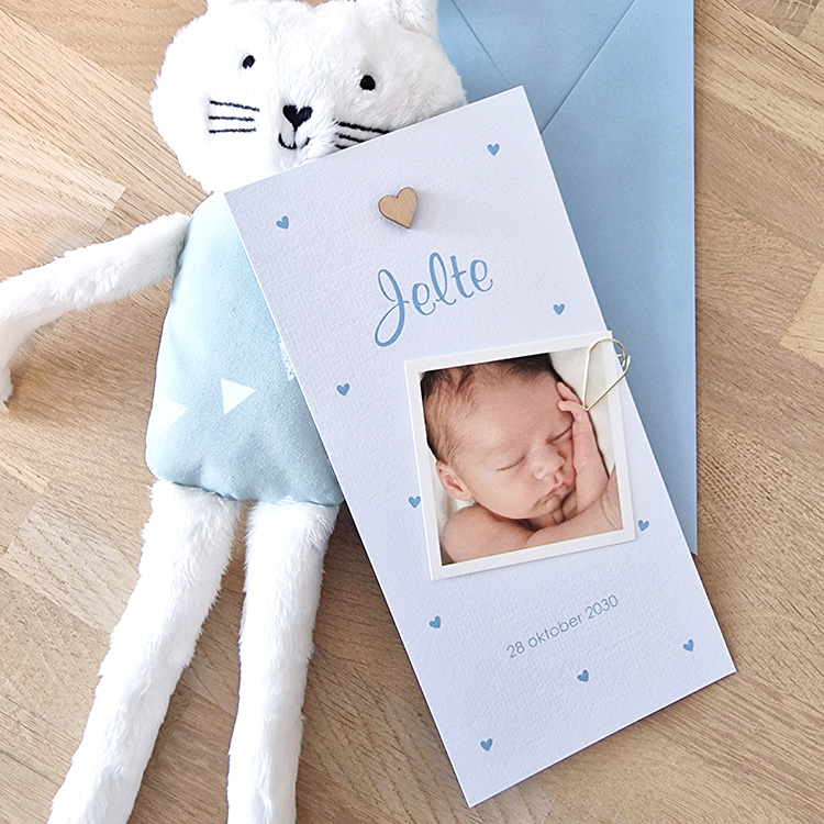 Mooi stijlvol geboortekaartje voor een jongen met blauwe hartjes. Leuk met houten vormpje en foto met paperclip (apart te bestellen).