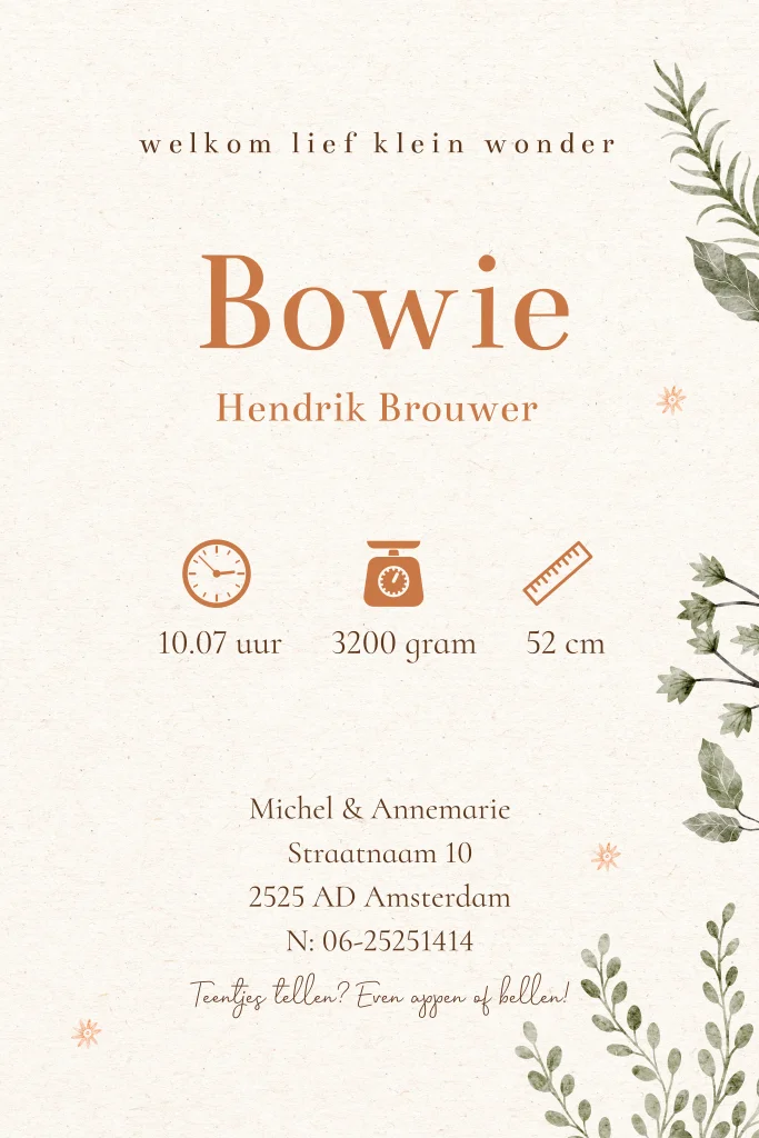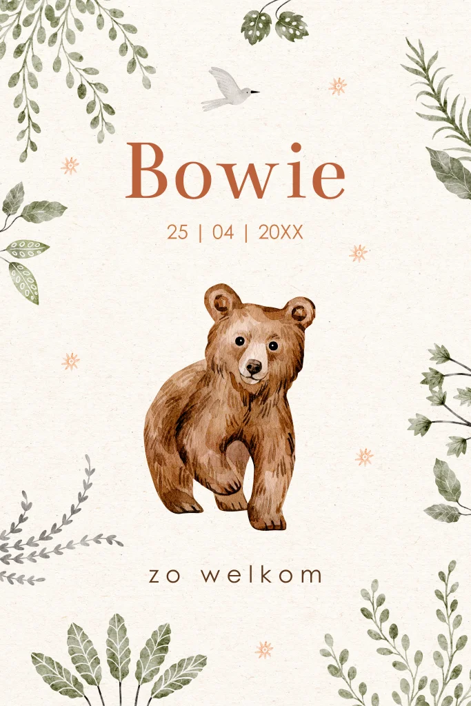 Geboortekaartje voor een jongen of meisje beige wit met lief beertje, groene bladeren en hoogglans.