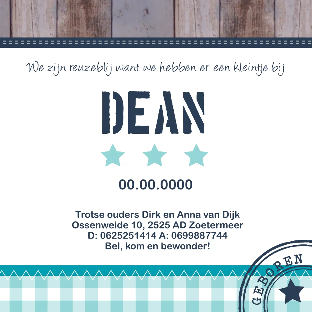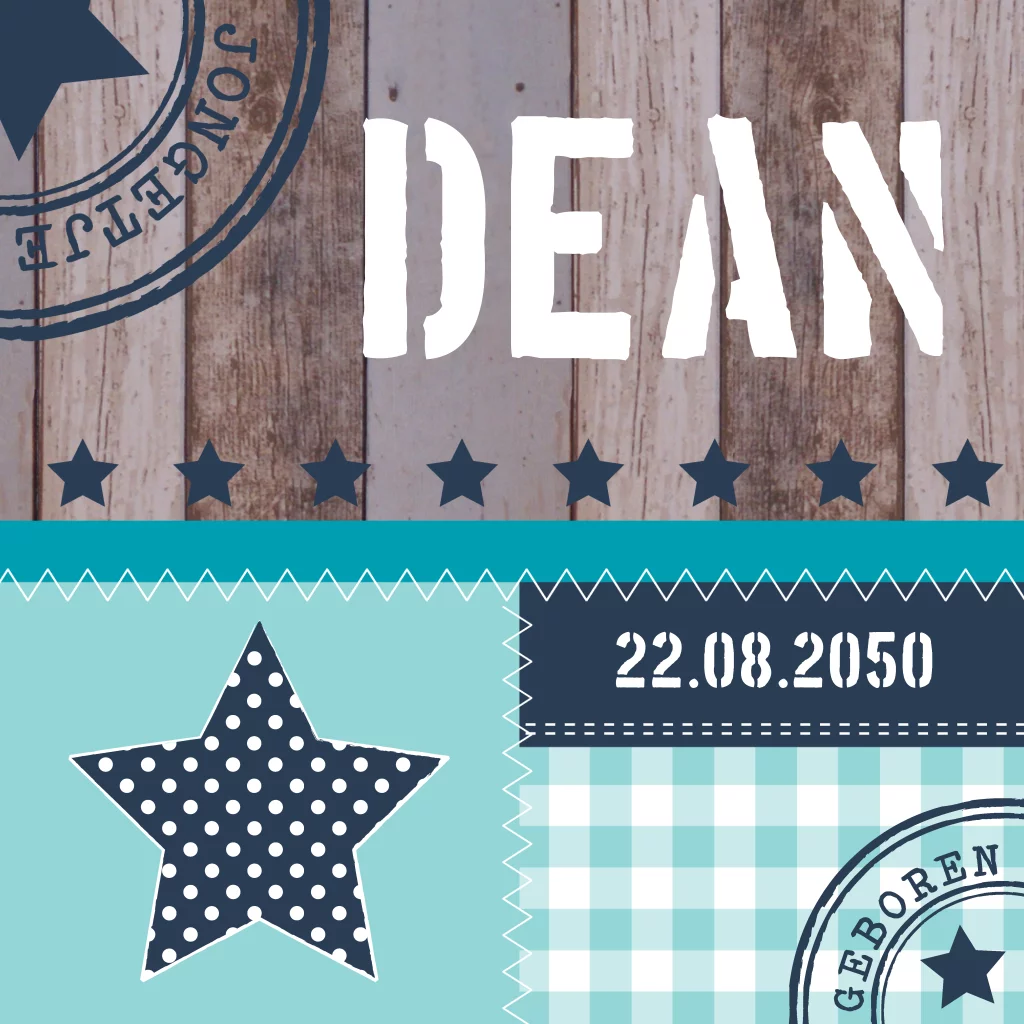 Stoer geboortekaartje voor een jongen met houtlook en sterren.