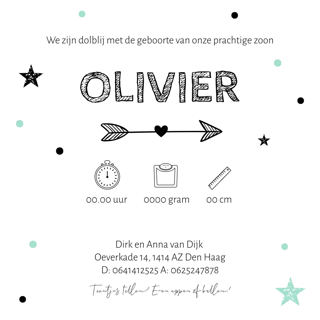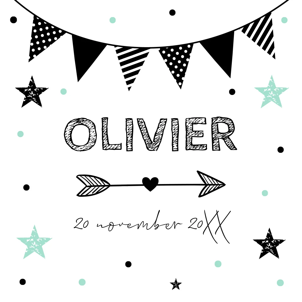 Geboortekaartje jongen zwart wit groen slinger sterren