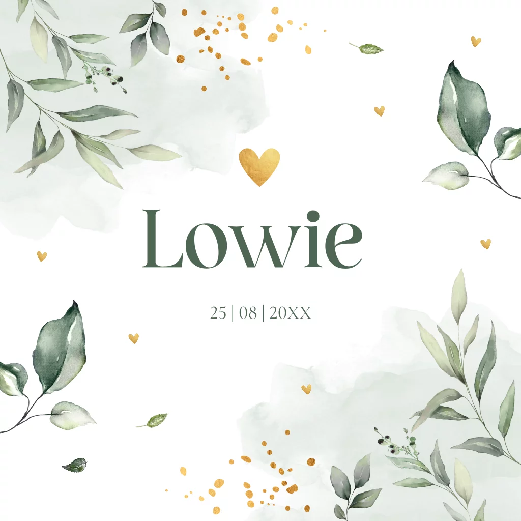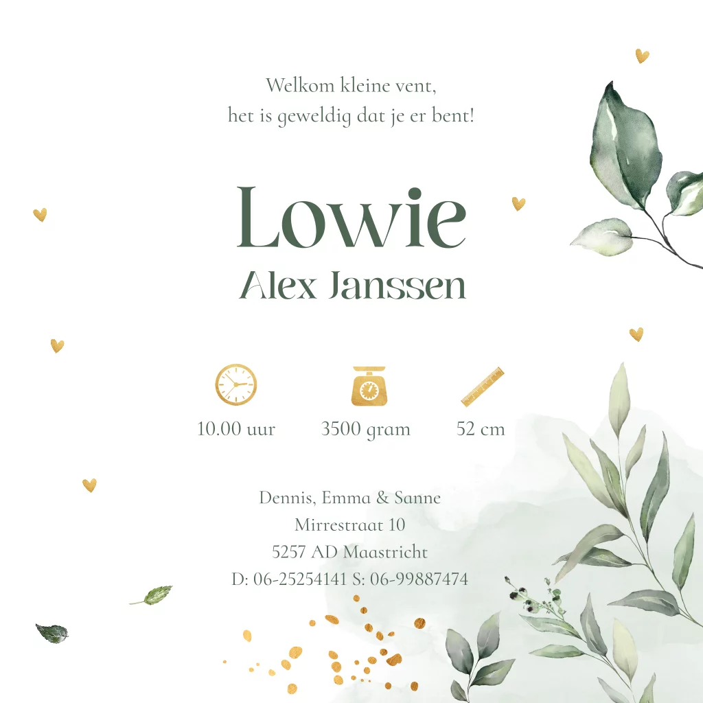 Geboortekaartje jongen groen botanisch bladeren goud look