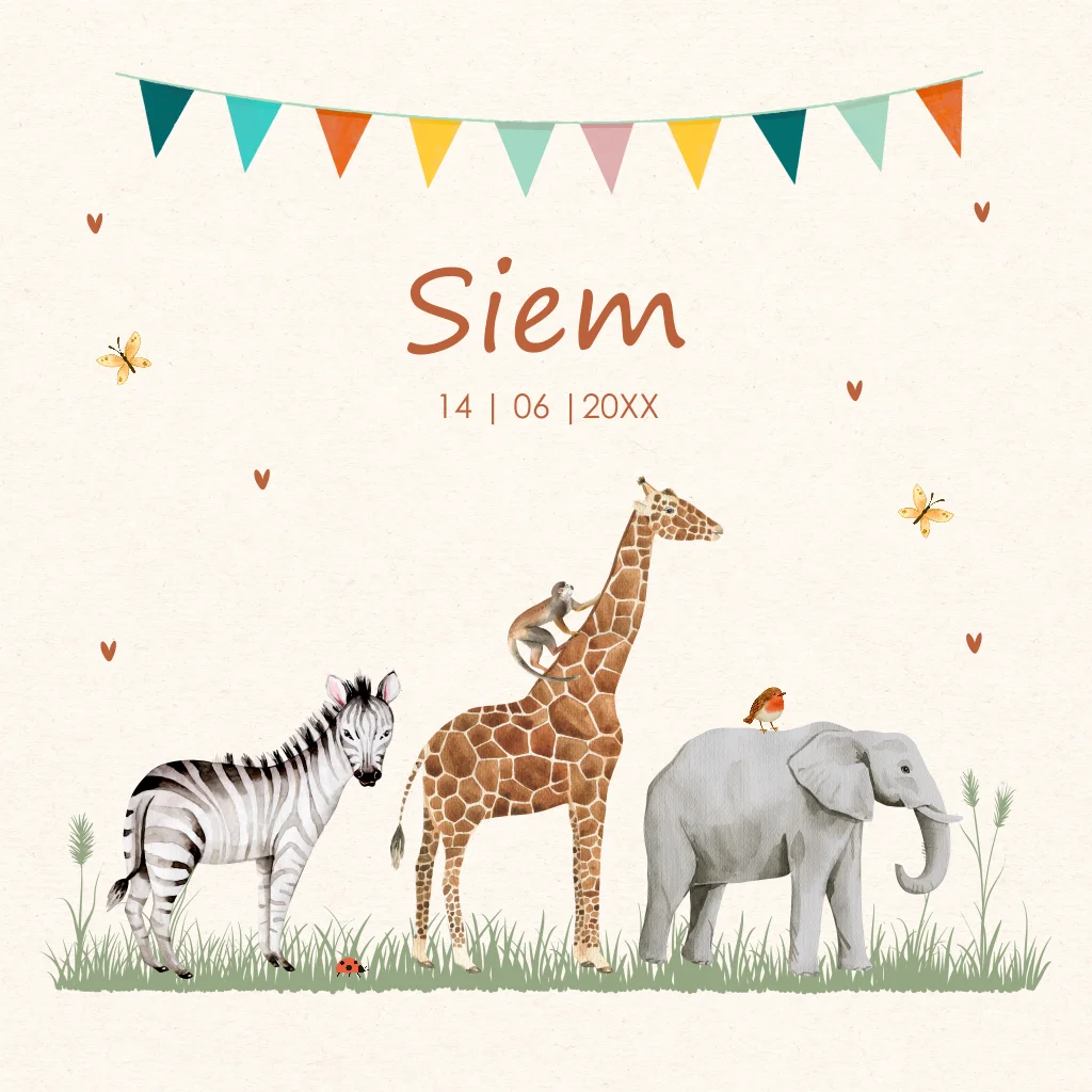 Geboortekaartje voor een jongen of meisje met safari dieren en slinger. Kies voor dit prachtige geboortekaartje met olifantje, giraffe, zebra, vlinders en aapje.