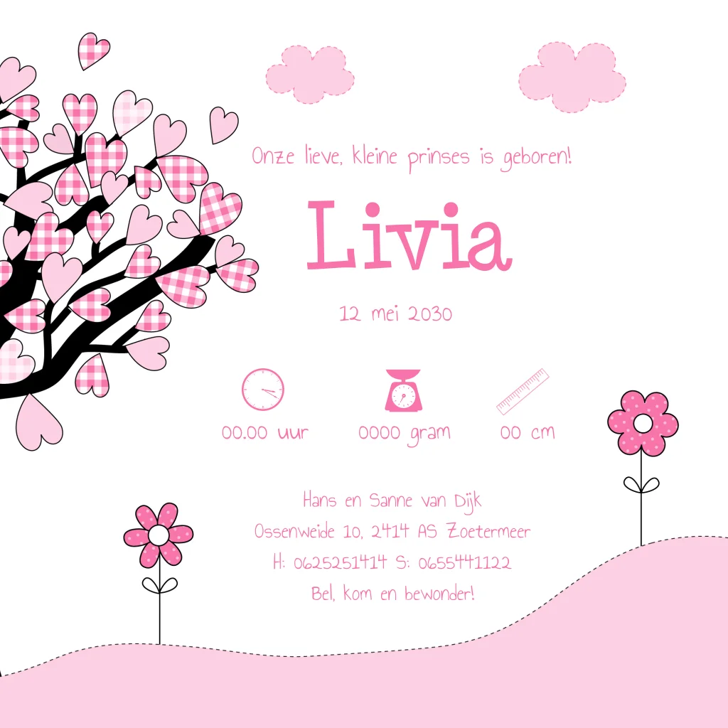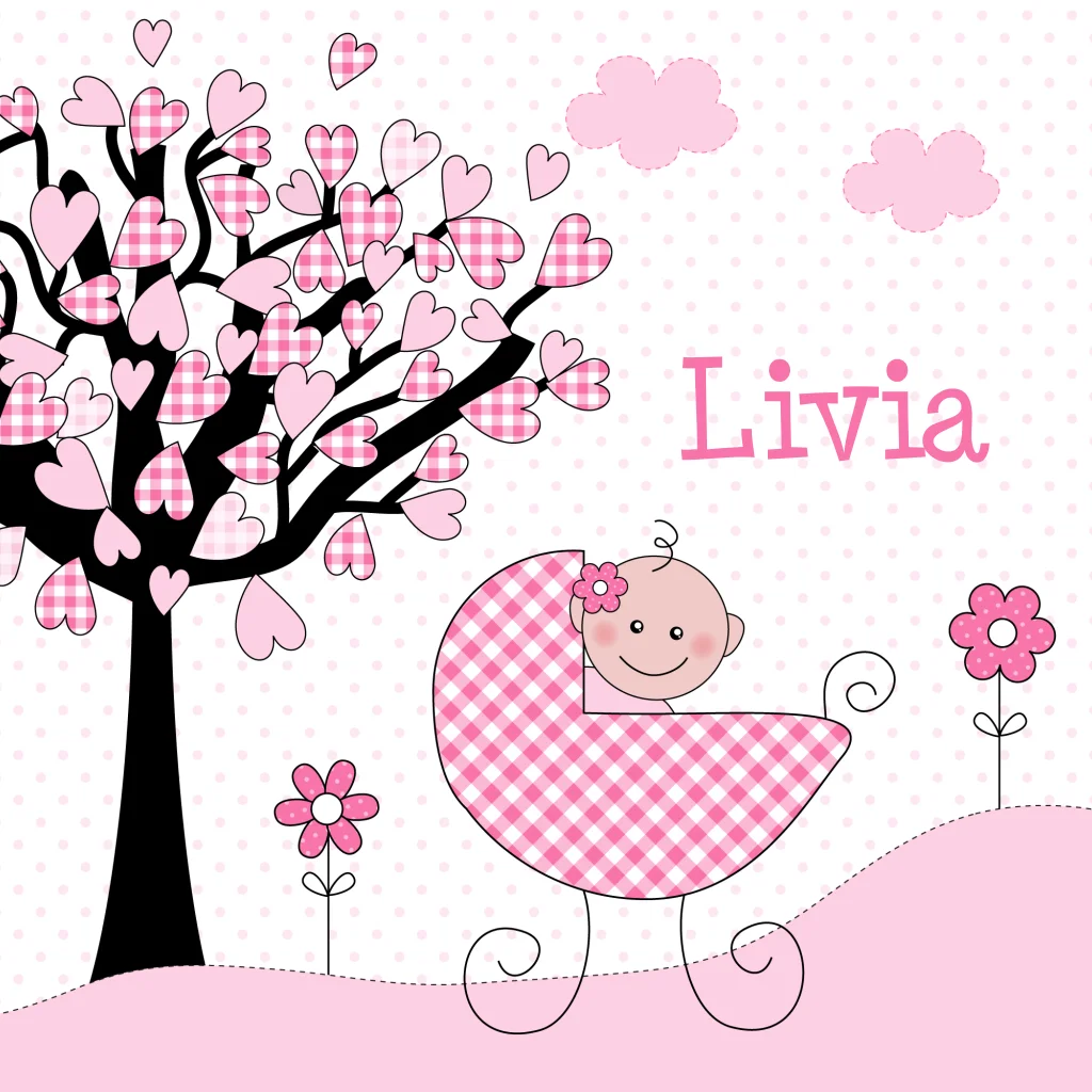 Lief geboortekaartje voor een meisje met baby in kinderwagen.