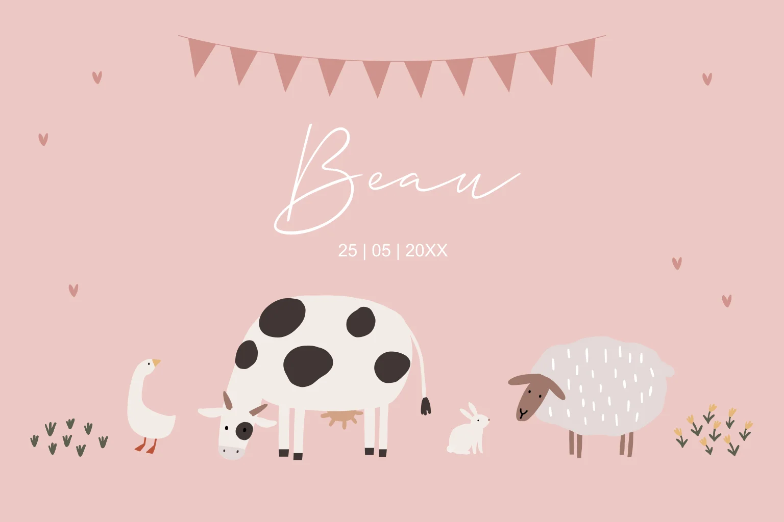 Geboortekaartje roze voor een meisje of meisje groen met boerderij dieren, koe, schaap, konijn en gans.