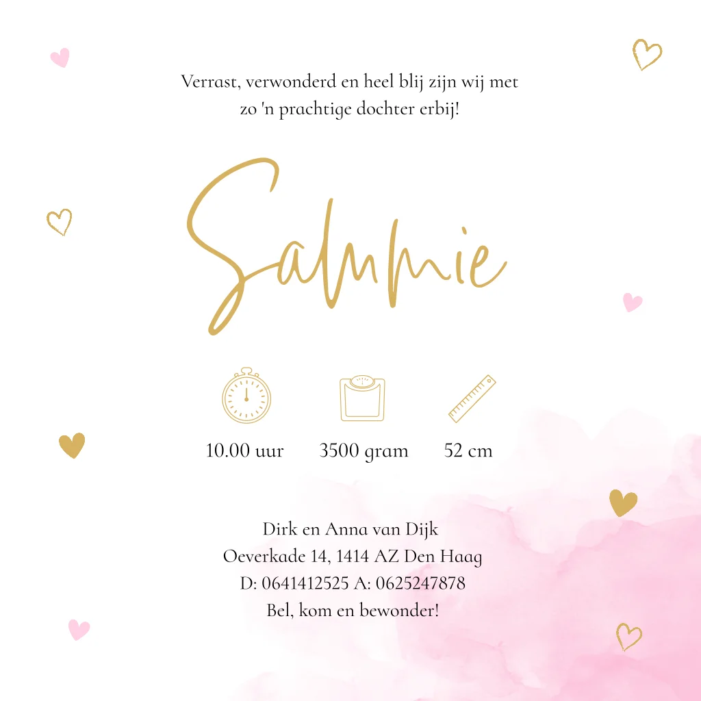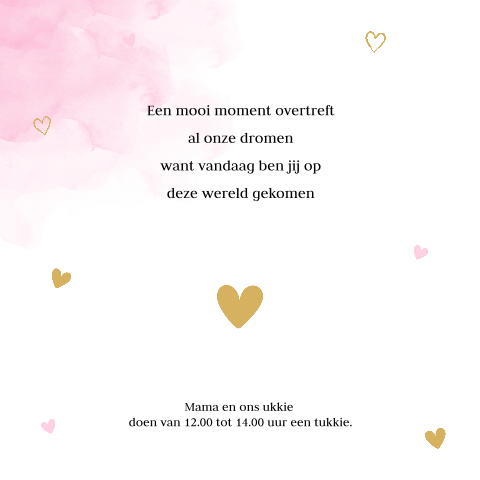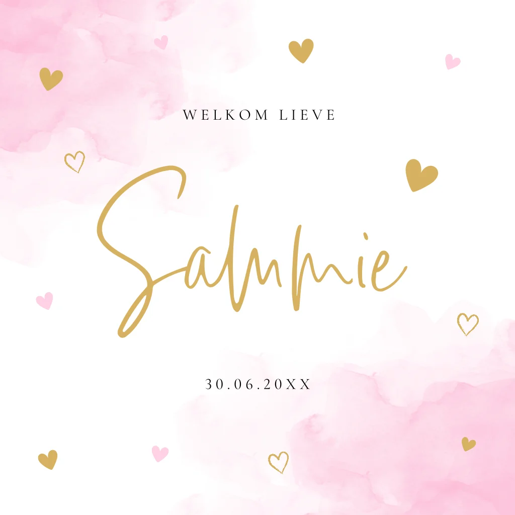 Hip geboortekaartje voor een meisje met roze hartjes en waterverf.