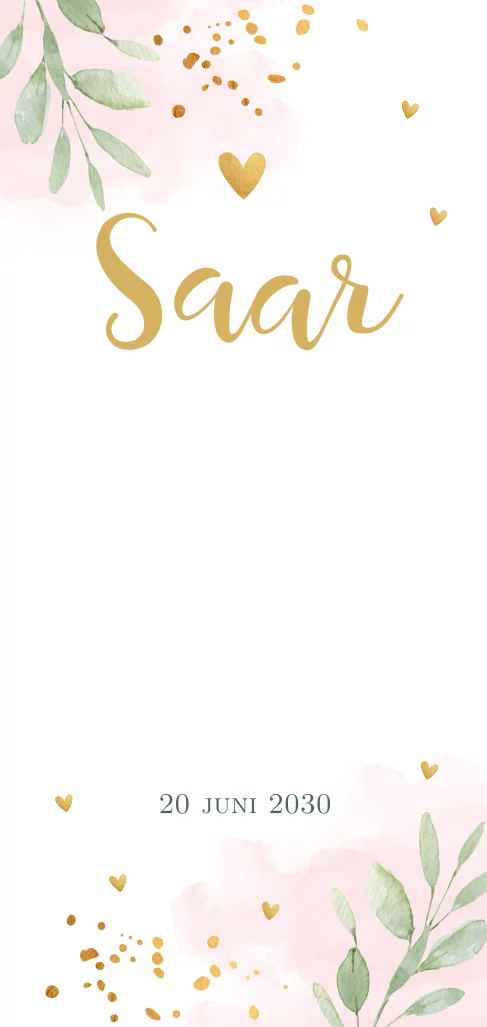 Geboortekaartje langwerpig voor een meisje met waterverf mintgroen, takjes, hartjes goudlook in botanische stijl. Foto +/- 7 x 7 cm. De foto kan je vastmaken met een paperclip of touwtje. De paperclips en foto's zijn apart te bestellen.