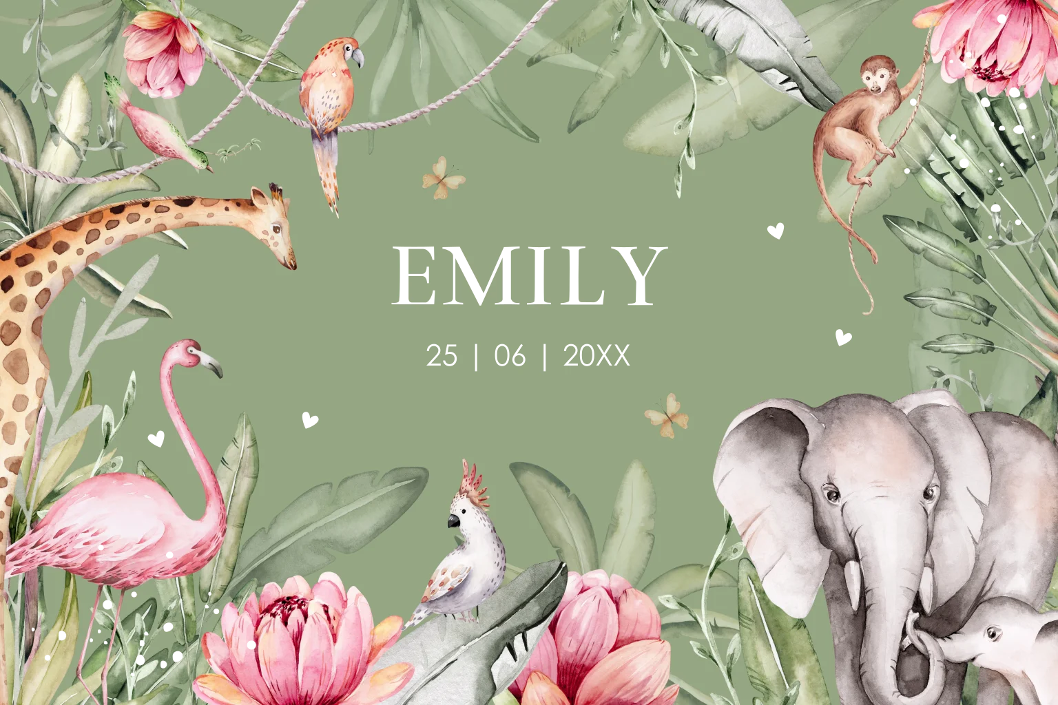 Geboortekaartje voor een meisje met jungle dieren en goudfolie. Kies voor dit super leuke geboortekaartje met olifantje, giraffe, flamingo, aapje, vogels en vlinders.