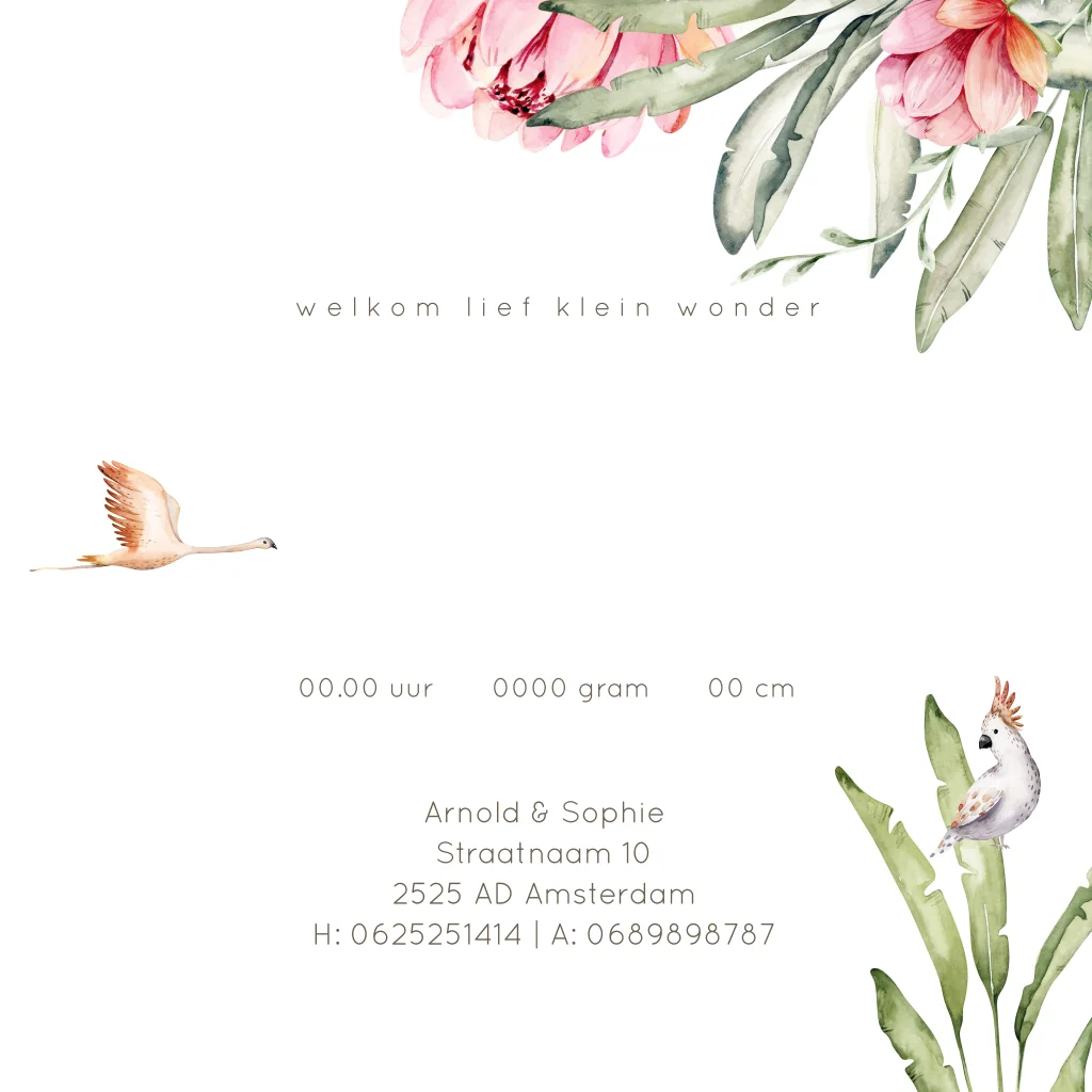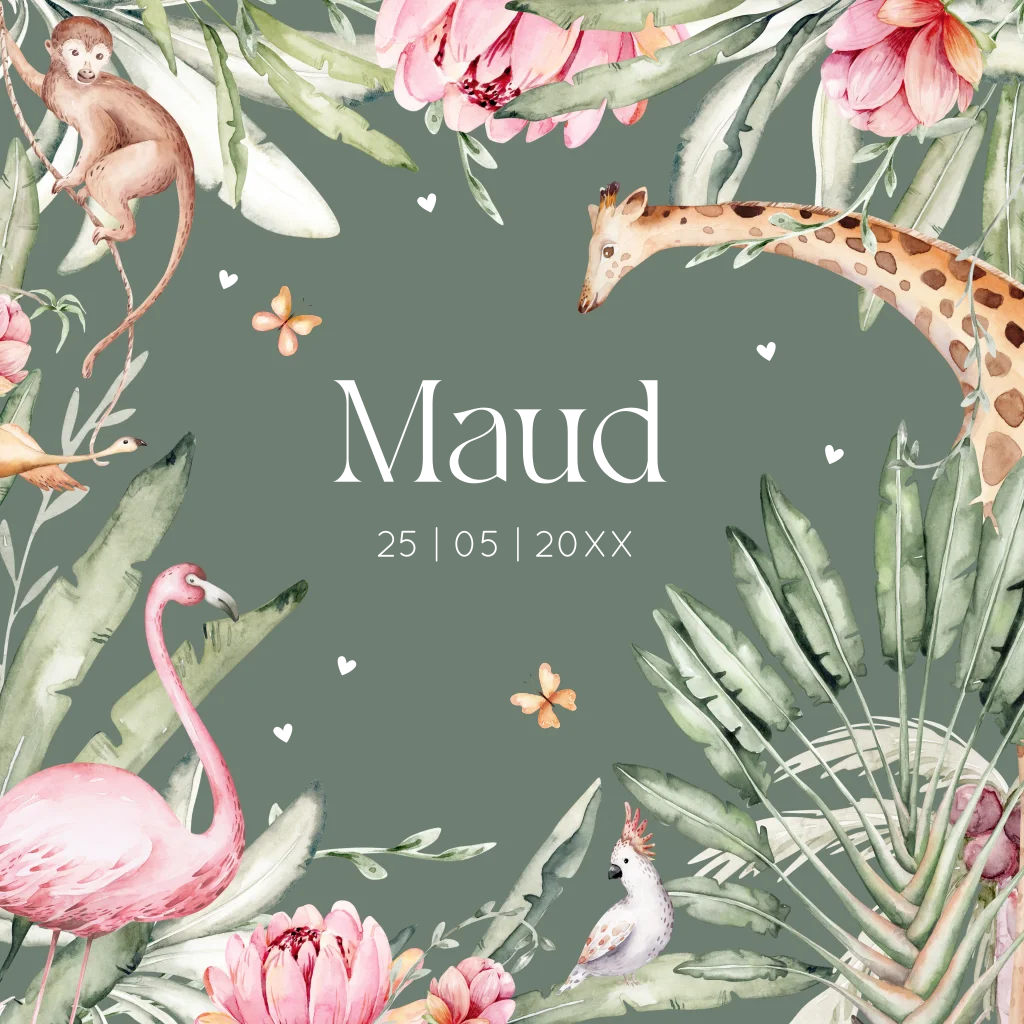 Geboortekaartje groen roze voor een meisje met jungle thema en dieren. Kies voor dit hippe geboortekaartje met giraffe, flamingo, aapje, vogels en vlinders.