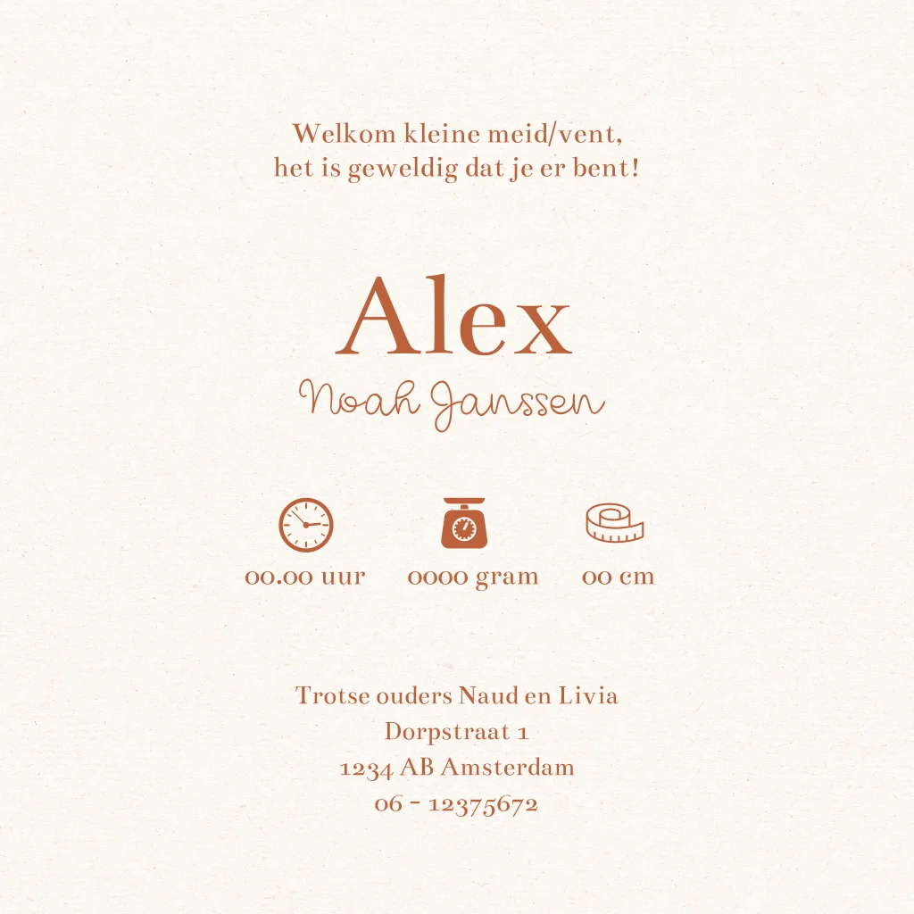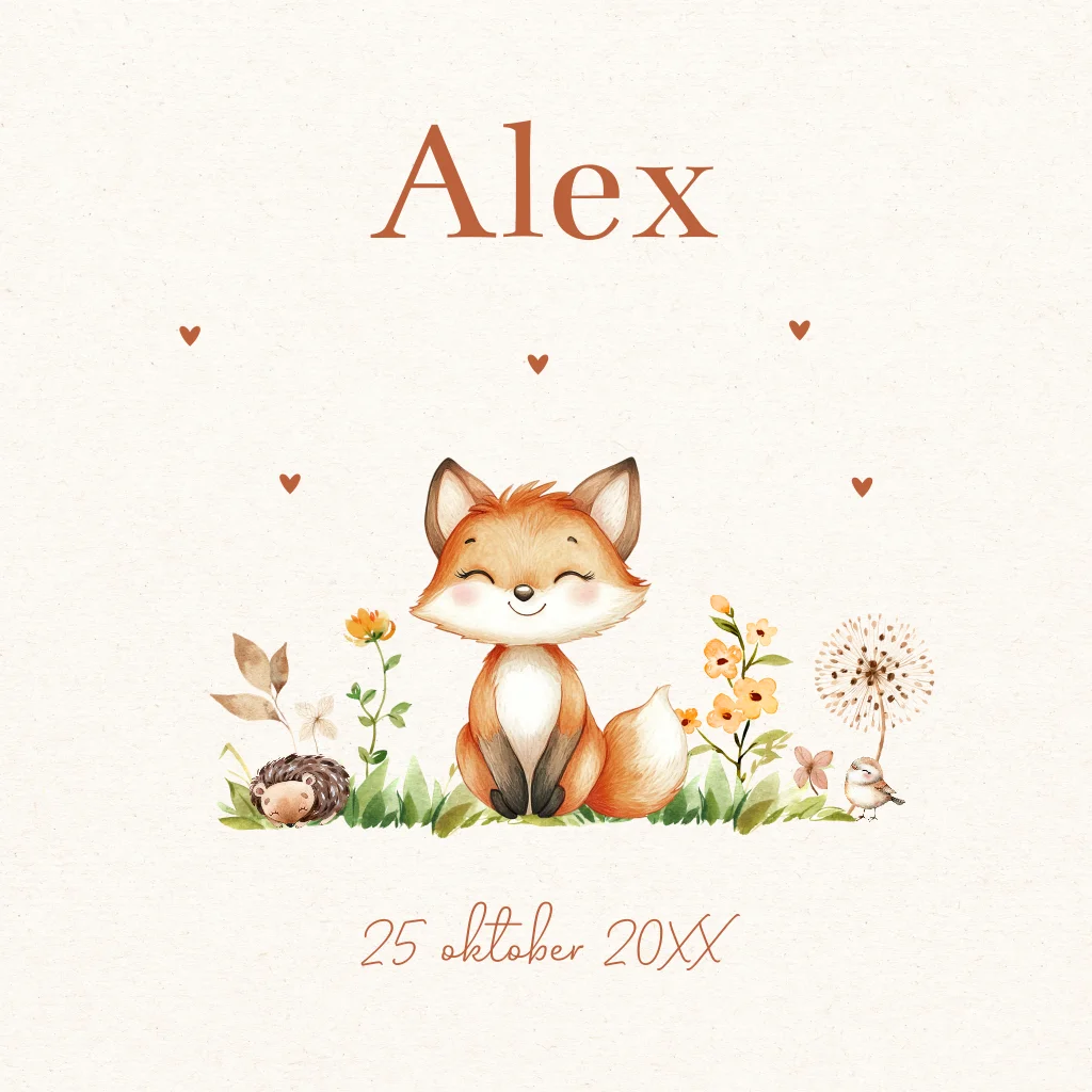 Prachtig geboortekaartje voor een jongen of meisje met aquarel vosje, gras en bloemen. Je kunt deze kaart eenvoudig aanpassen naar je eigen wensen. Maak dit geboortekaartje helemaal in stijl af met de roestbruine envelopkleur en bijpassende sluitzegel.