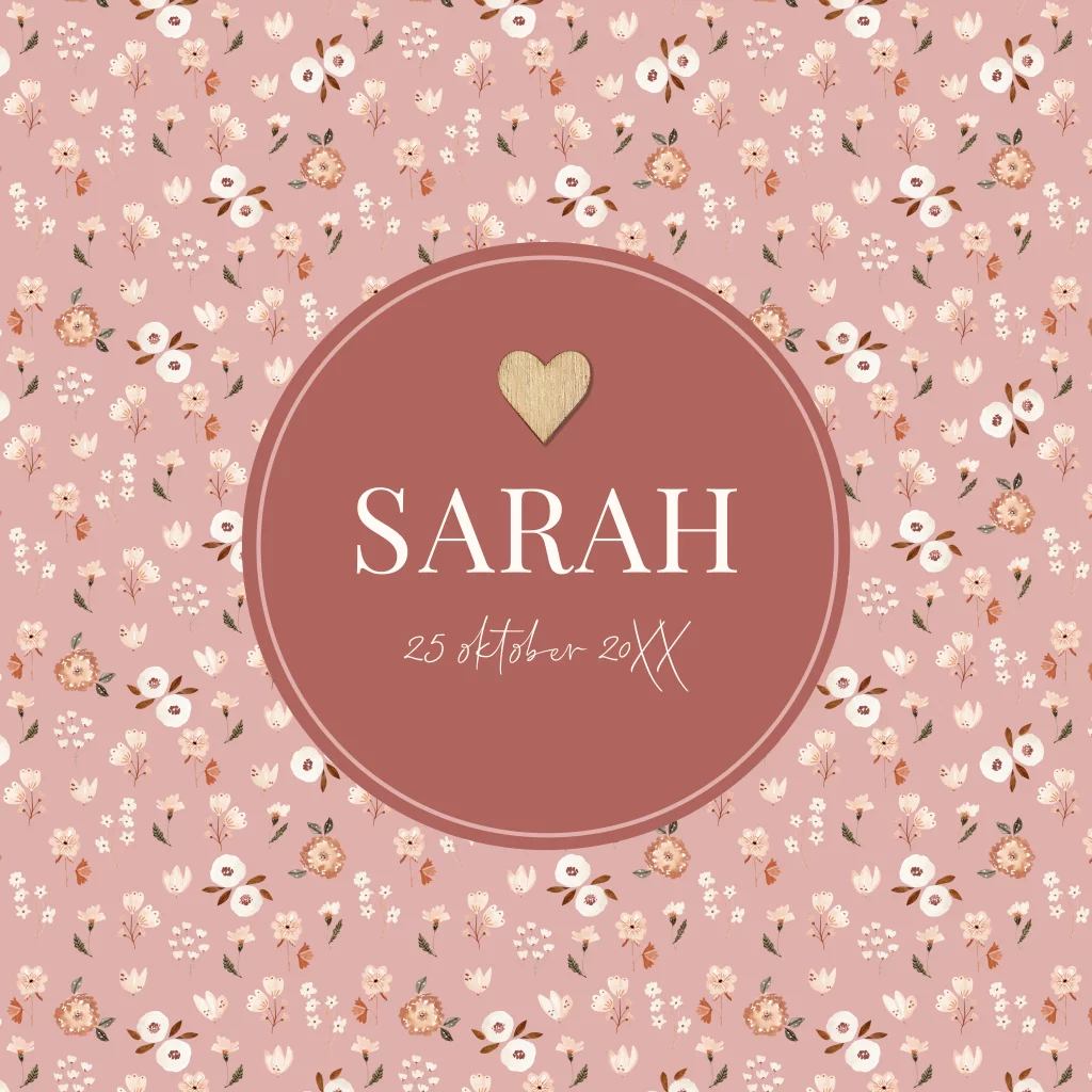 Geboortekaartje meisje oudroze bloemen houten hartje
