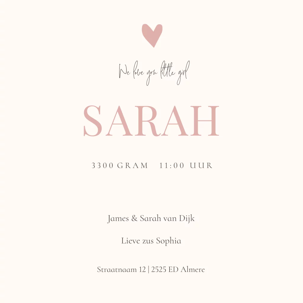 Geboortekaartje voor een meisje roze bloemen patroon en houten vormpje hartje. De houten vormpjes zijn apart te bestellen.