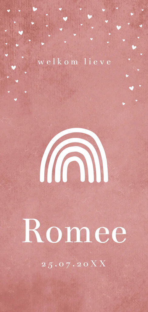 Geboortekaartje voor een meisje langwerpig roze met regenboogje en goudfolie.
