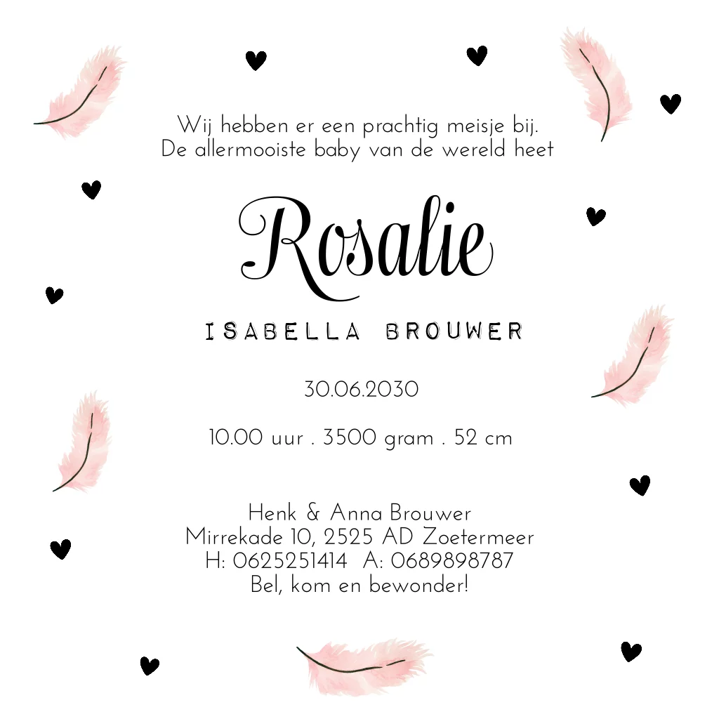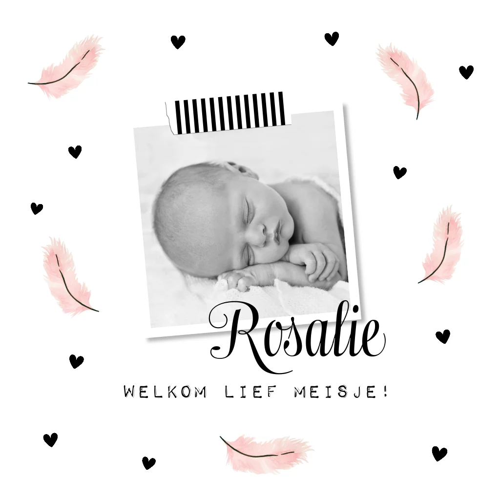 Geboortekaartje voor een meisje met roze veertjes eigen foto.