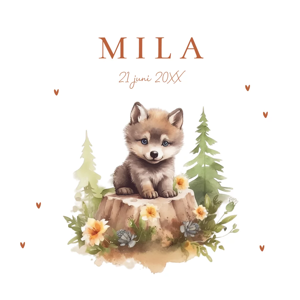 Geboortekaartje voor een meisje met lief watercolour wolfje, gras en bloemen.