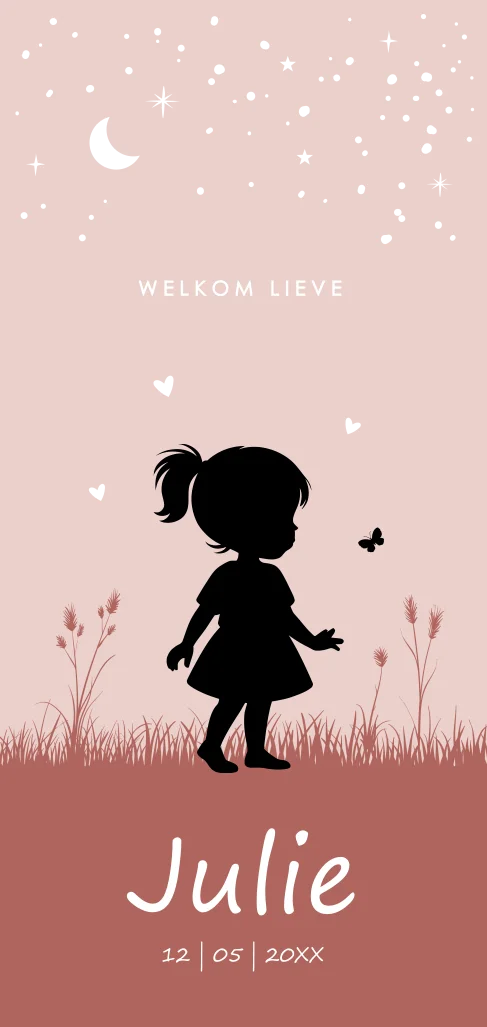 Geboortekaartje langwerpig roze met silhouet meisje met vlinders en bloemen.