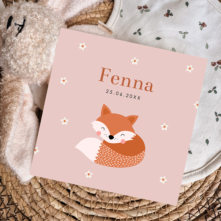 Lief geboortekaartje voor een meisje met vosje en roze bloemen. Kies voor dit originele geboortekaartje met bosdieren thema!
