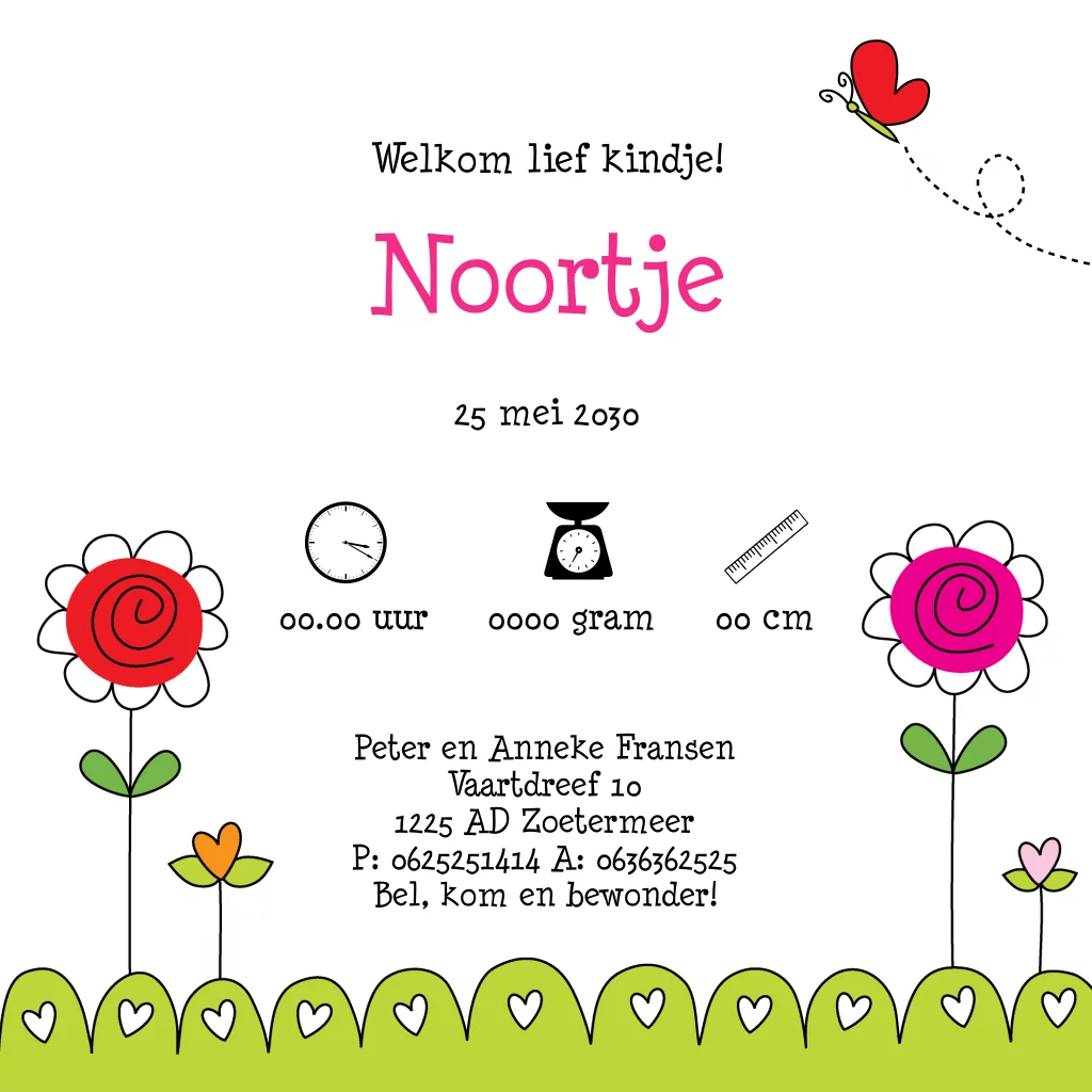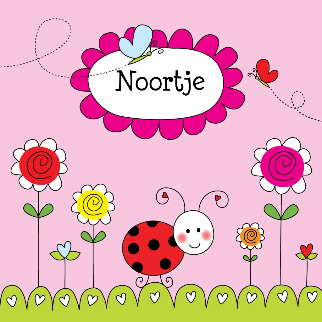 Mooi en origineel geboortekaartje voor een meisje met lieveheersbeestje en bloemen.