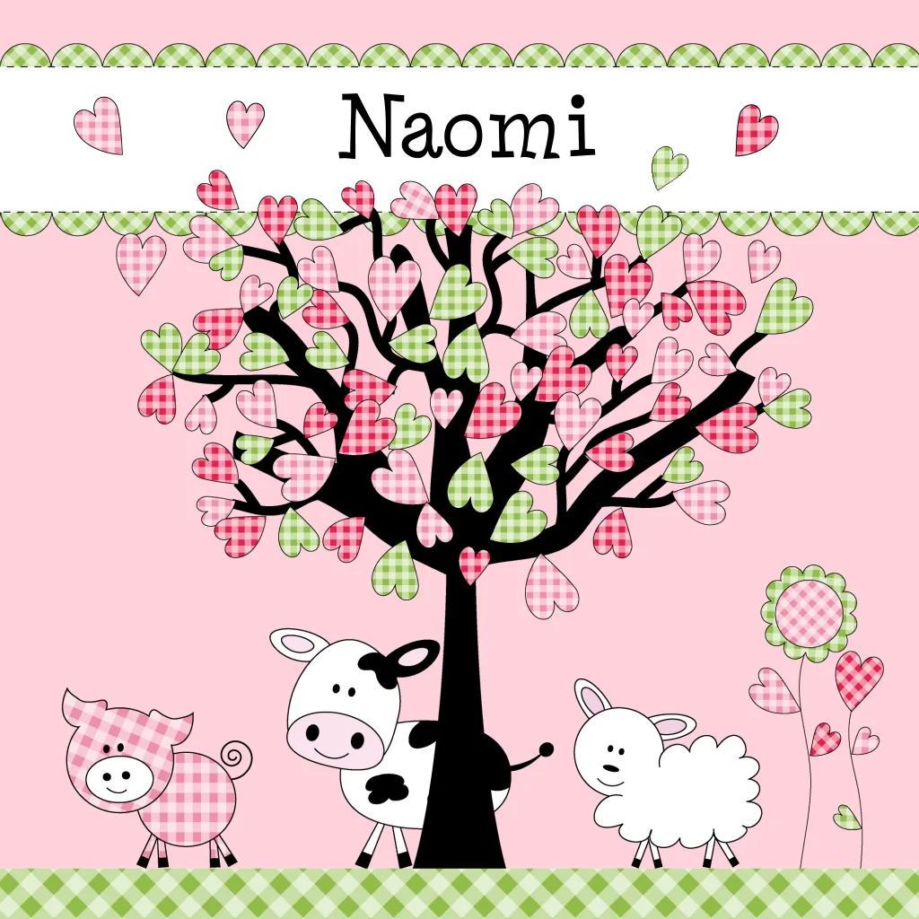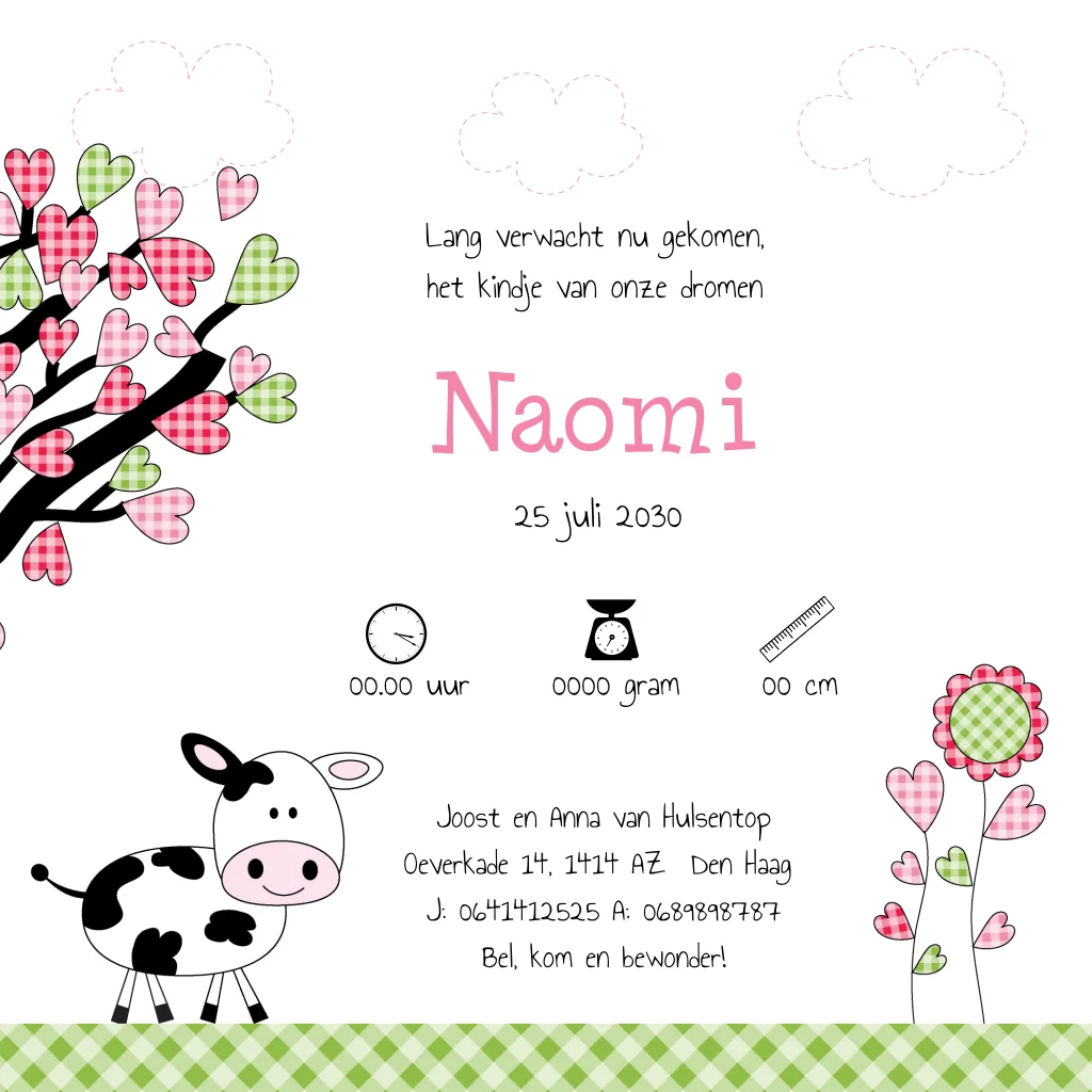 Geboortekaartje roze voor een meisje met dieren, koe, schaap en boom met hartjes.
