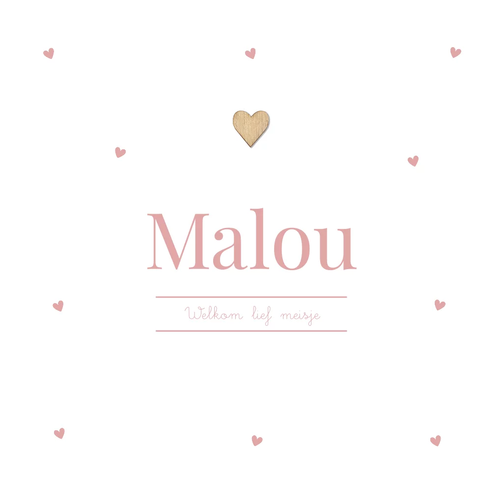 Lief geboortekaartje voor een meisje met roze hartjes en houten vormpje. De houten vormpjes kan je apart bestellen.