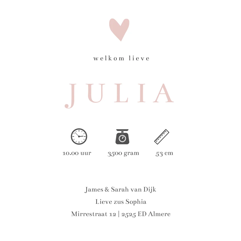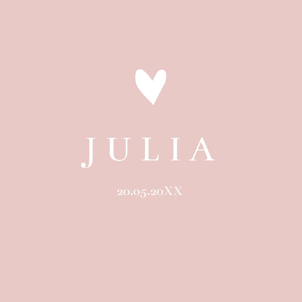 Minimalistisch geboortekaartje voor een meisje oudroze met hartje. Pas de kleuren naar wens aan.