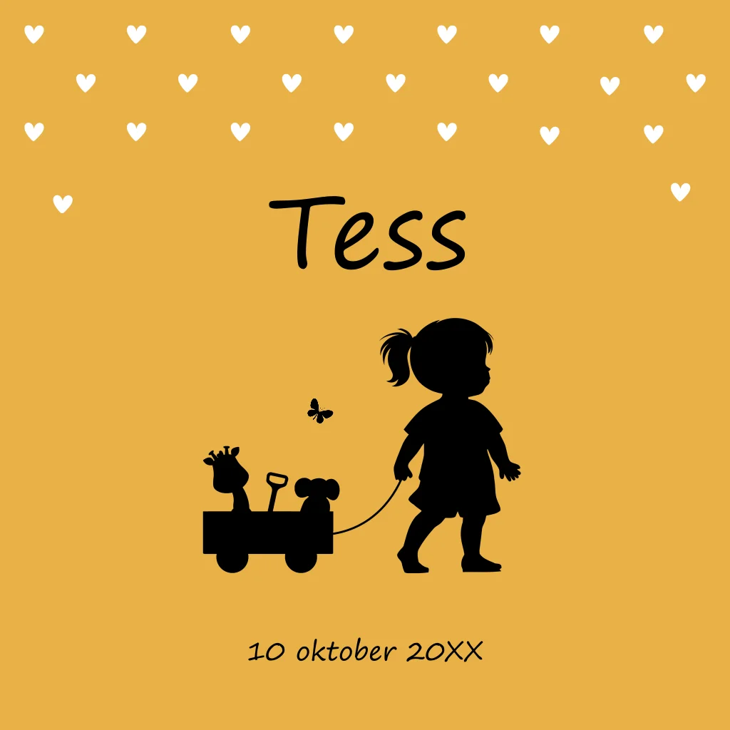 Geboortekaartje voor een meisje met silhouet, kar en hartjes. Pas de kleuren naar wens aan.