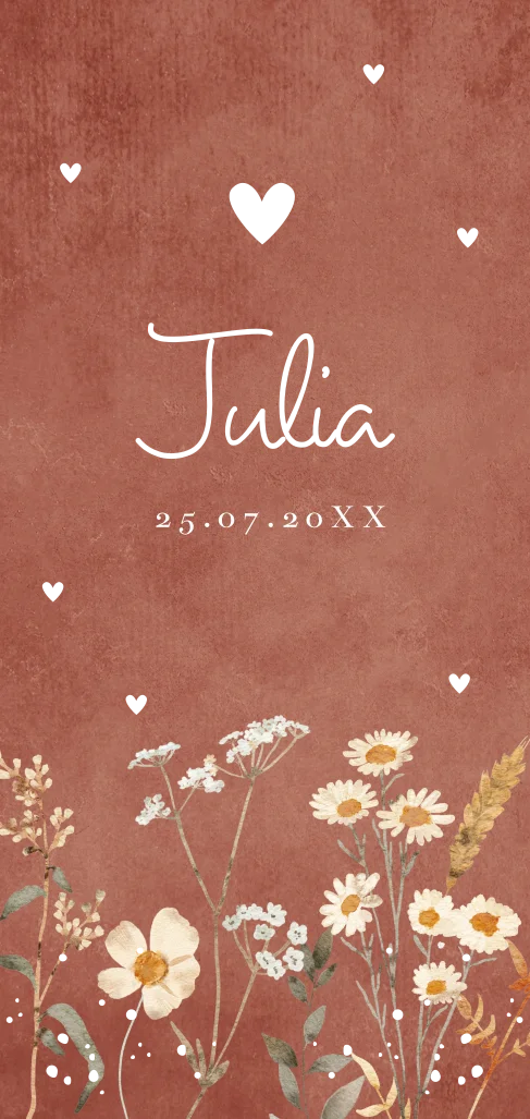 Geboortekaartje bloemen roestbruin langwerpig goudfolie.