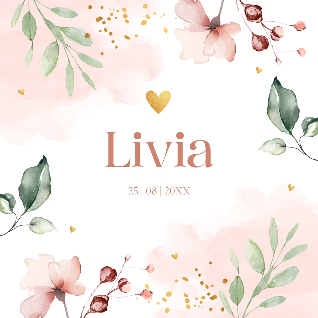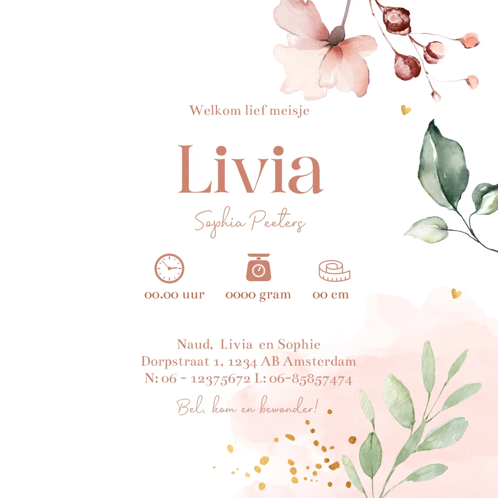 Prachtig geboortekaartje voor een meisje met aquarel bloemen, roze waterverf en goudlook accenten. Je kunt deze kaart eenvoudig aanpassen naar je eigen wensen. Maak dit geboortekaartje helemaal in stijl af met de oudroze envelopkleur en bijpassende sluitzegel.