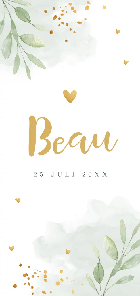 Geboortekaartje langwerpig botanisch voor een jongen met waterverf, bladeren en goud look hartjes.