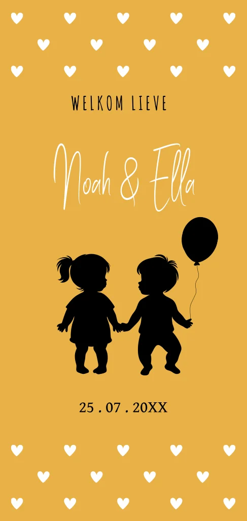 Geboortekaartje langwerpig voor een tweeling meisje en jongen met silhouet, vlinders en hartjes okergeel. Pas de kleuren naar wens aan.
