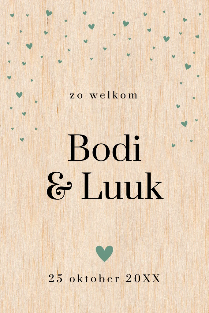 Geboortekaartje voor een tweeling jongens op echt hout met hartjes.