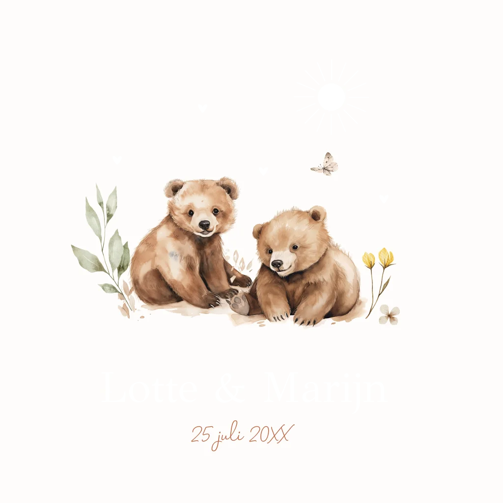 Geboortekaartje voor een tweeling met lieve beertjes, zon en goudfolie.