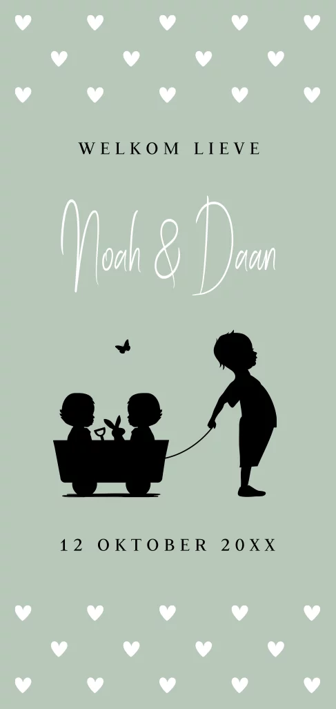 Origineel en lief geboortekaartje groen langwerpig voor een tweeling jongens met grote broer silhouet.