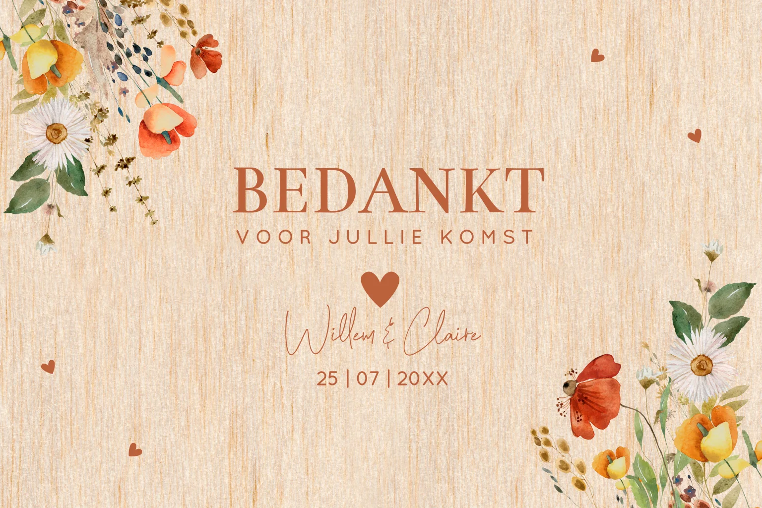 Bedankkaart op echt hout met mooie veldbloemen rood en geel.