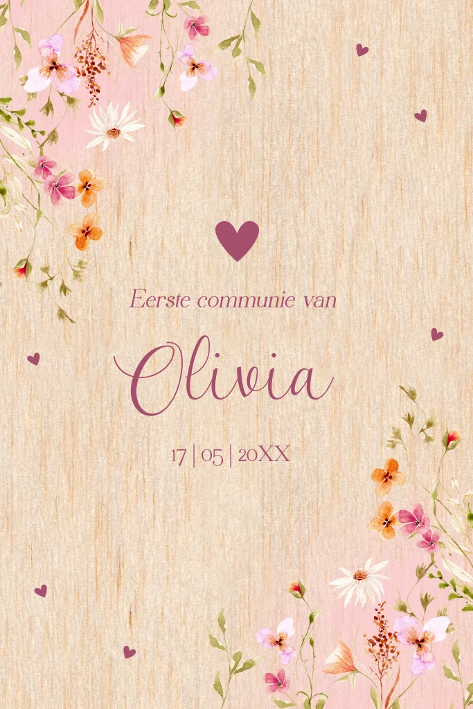 Communie uitnodiging op echt hout voor een meisje met watercolour bloemen roze. • Hout is een natuurlijk product, dus ieder kaartje is uniek. • Het is niet mogelijk om de kleur 'wit' te drukken.