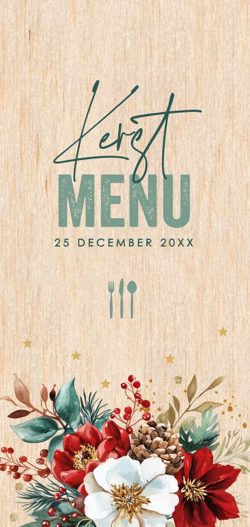 Kerstmenukaart echt hout langwerpig botanisch bladeren groen