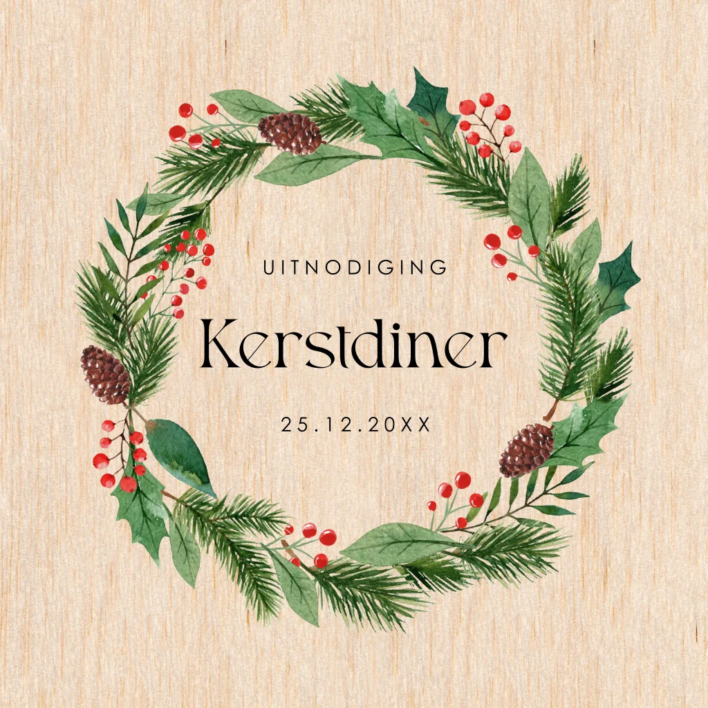 Kerstdiner uitnodiging met kerstkrans groen op echt hout. Let op, dit is een houten kaartje: