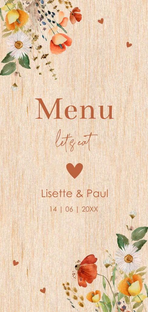 Menukaart huwelijk veldbloemen rood echt hout
