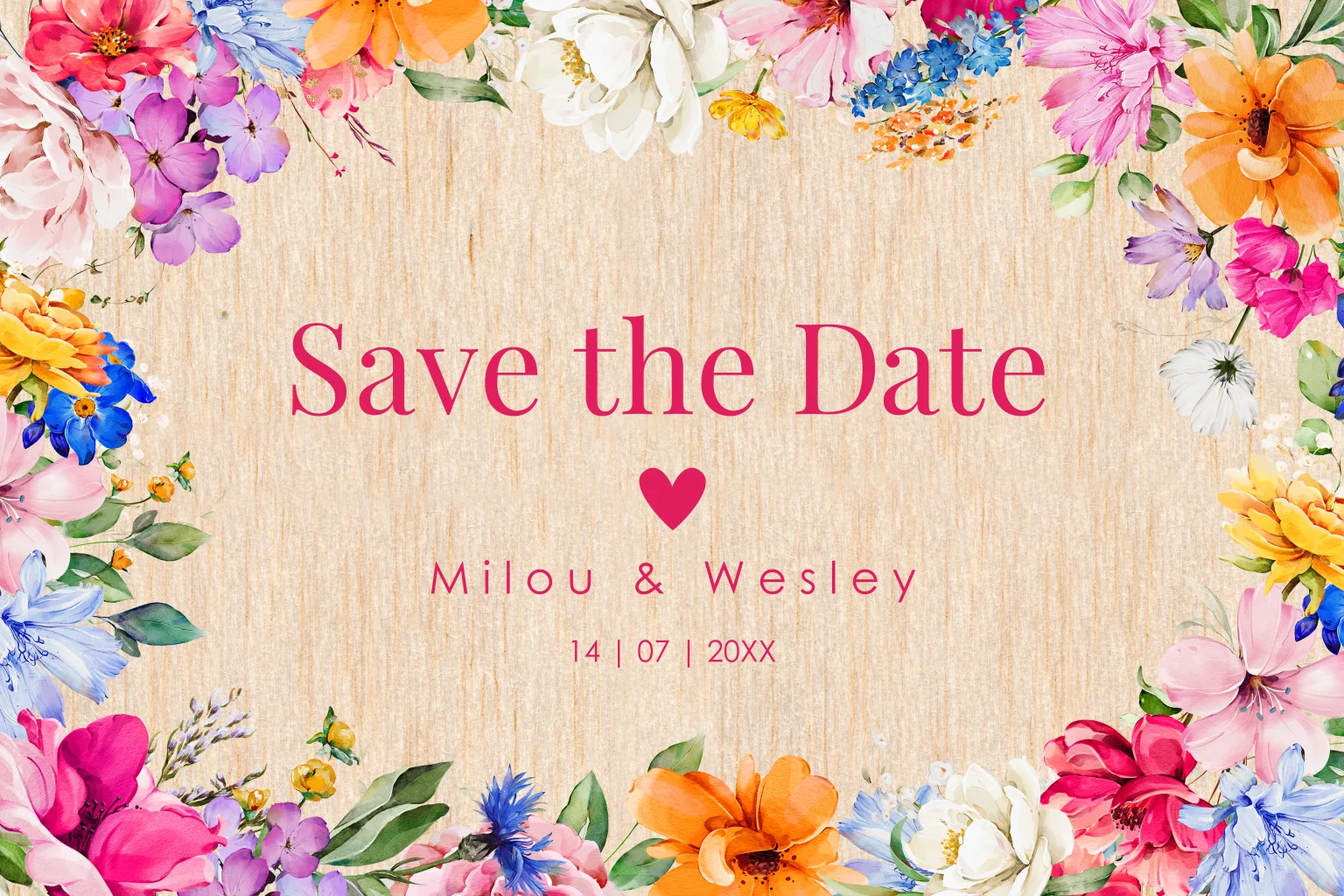 Deze prachtige Save the Date kaart is uniek dat perfect past bij een lente- of zomerbruiloft met een botanisch of bloemrijk thema. De kaart is voorzien van schitterende waterverf bloemen in kleurrijke tinten op een houten achtergrond, waardoor elk exemplaar een unieke uitstraling heeft dankzij de natuurlijke houtnerven. Let op, dit is een houten kaart: • Hout is een natuurlijk product, dus ieder kaartje is uniek. • Het is niet mogelijk om de kleur 'wit' te drukken.