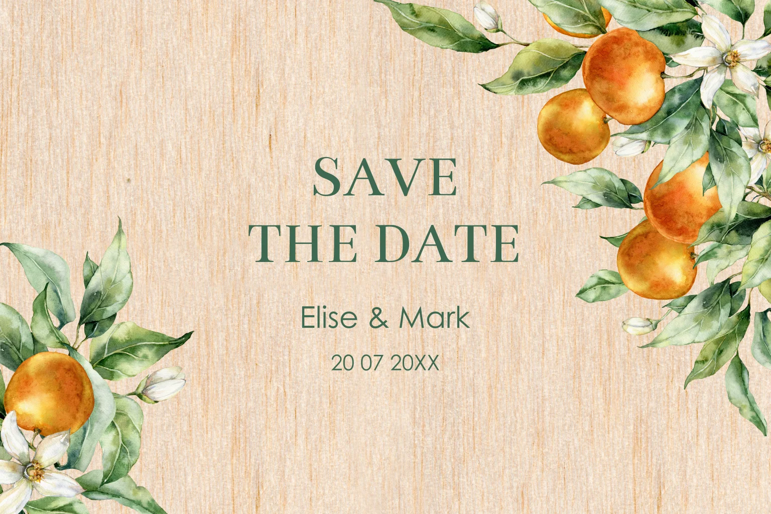 Save the Date kaart echt hout Mediterraans sinaasappels