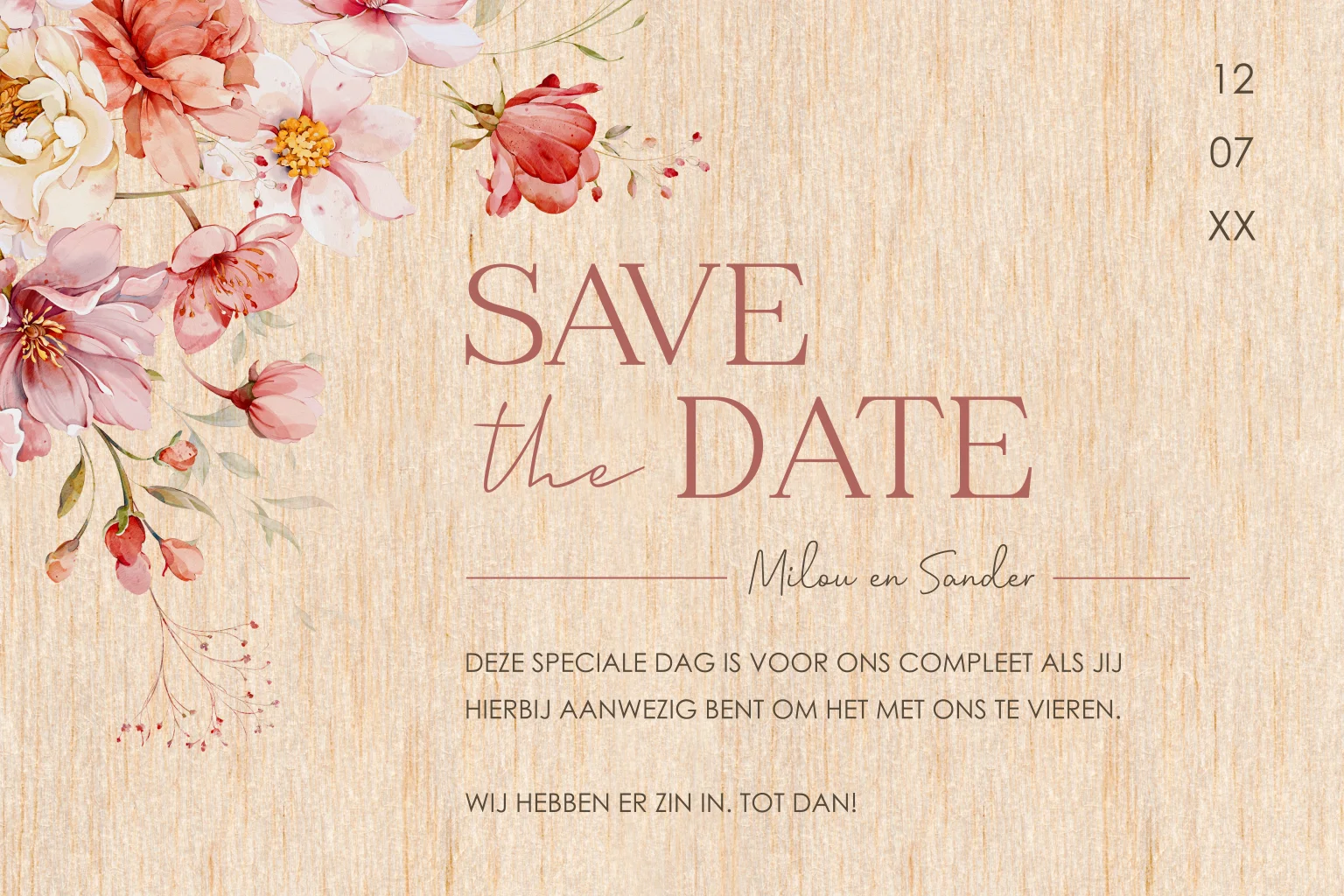 Save the Date kaart op echt hout met romantische zomerse bloemen. Let op, dit is een houten kaart: • Hout is een natuurlijk product, dus ieder kaartje is uniek. • Het is niet mogelijk om de kleur 'wit' te drukken.