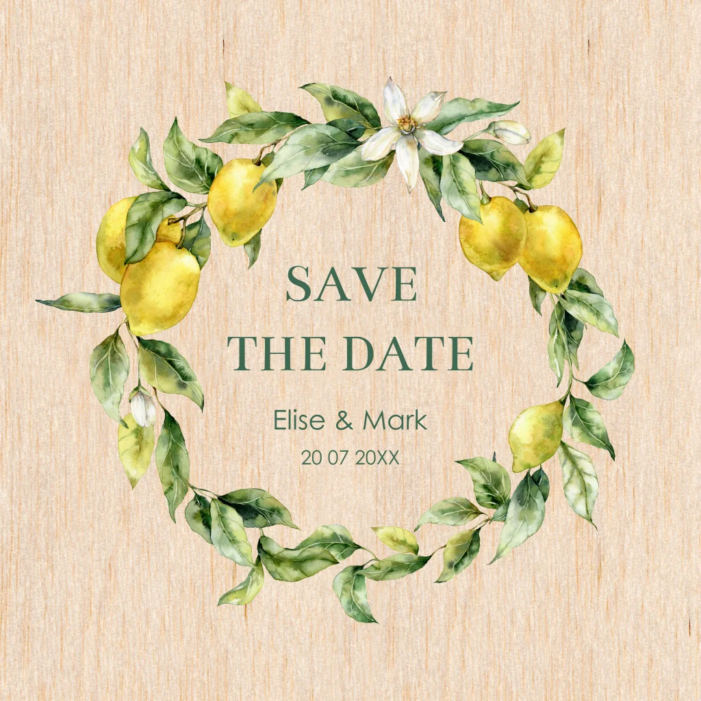 Save the Date kaart echt hout Mediterraans citroenen geel