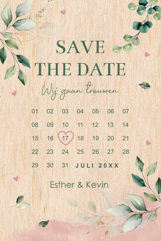 Stijlvolle Save the Date uitnodiging met kalender om jullie bruiloft op een originele manier aan te kondigen. Wat dit kaartje zo bijzonder maakt? Het wordt gedrukt op écht berkenhout!