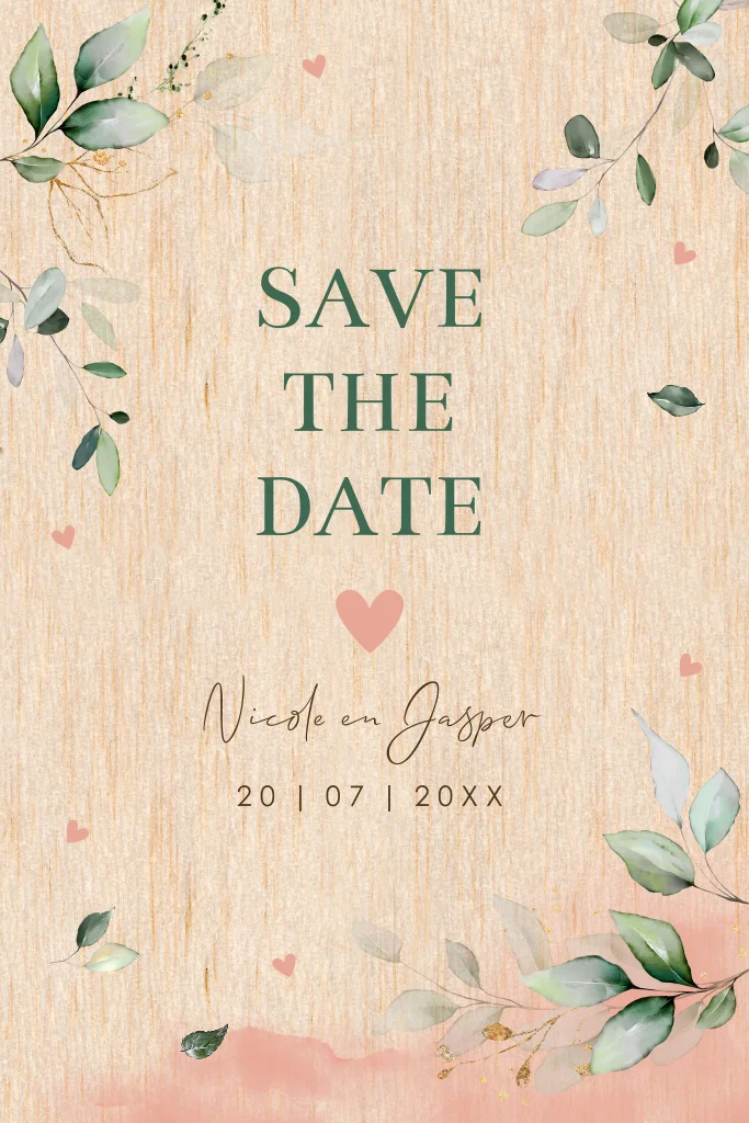 Save the Date kaart echt hout kalender botanisch