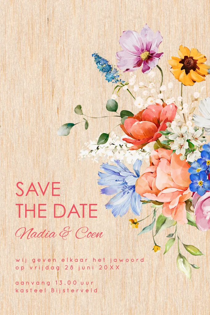 Romantische Save the Date kaart op echt hout met waterverf bloemen.