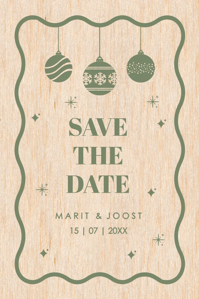 Save the Date kerstkaart op echt hout met golvend kader en kerstballen groen. Wat dit kaartje zo bijzonder maakt? Het wordt gedrukt op écht berkenhout!