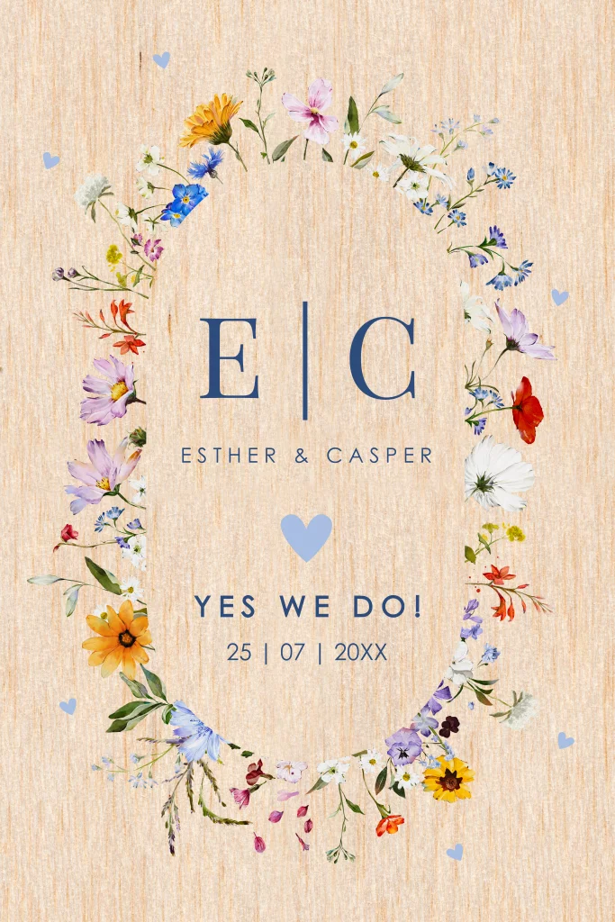 Romantische trouwkaart op echt hout met romantische bloemen blauw.