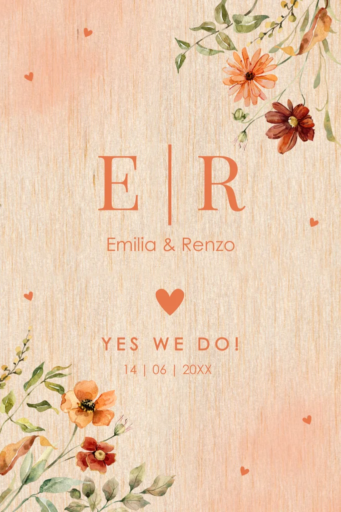 Trouwkaart op echt hout met prachtige watercolour bloemen pasteloranje. Let op, dit is een houten kaart: • Hout is een natuurlijk product, dus ieder kaartje is uniek. • Het is niet mogelijk om de kleur 'wit' te drukken.